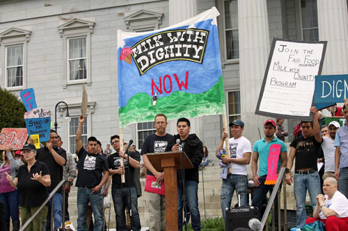 On May Day a powerful grassroots movement of Vermont dairy farmworkers marched in the streets of Montpelier, VT with hundreds of workers and allies demanding Vermont step up its commitment to workers' rights. Farmworker leader Enrique Balcazar told a crowd of supporters that dairy workers are fed up with wage theft, dangerous working conditions, no time off, substandard housing, and no enforcement of their rights. He offered farmworkers' solution: