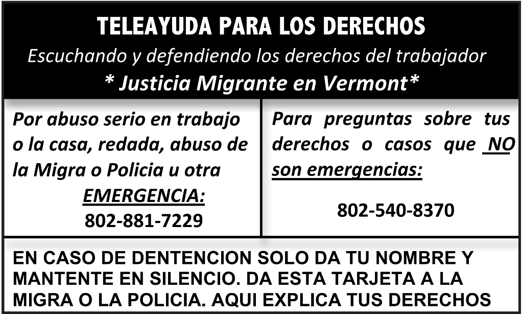 Justicia Migrante es una organización de derechos humanos formada y liderada por la comunidad de compañerxs inmigrantes en el estado de Vermont. Háblanos para más información: 802-658-6770 o búscanos en facebook: Migrant Justice / Justicia Migrante. Abajo se encuentra más información y recursos relevantes a la lucha por los derechos humanos y la justicia: