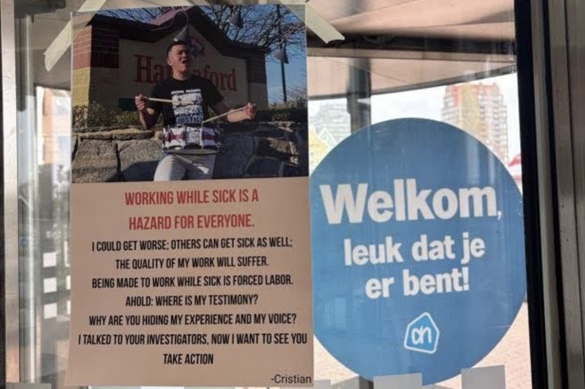 Posters included photos and testimonies of farmworkers in Ahold's US dairy supply chain denouncing abuses and calling for transparency and action