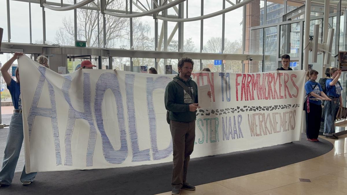 Migrant Justice and supporters enered the Zaandam, Netherlands headquarters of Ahold Delhaize and unfurled a banner reading Ahold: Listen to Farmworkers
